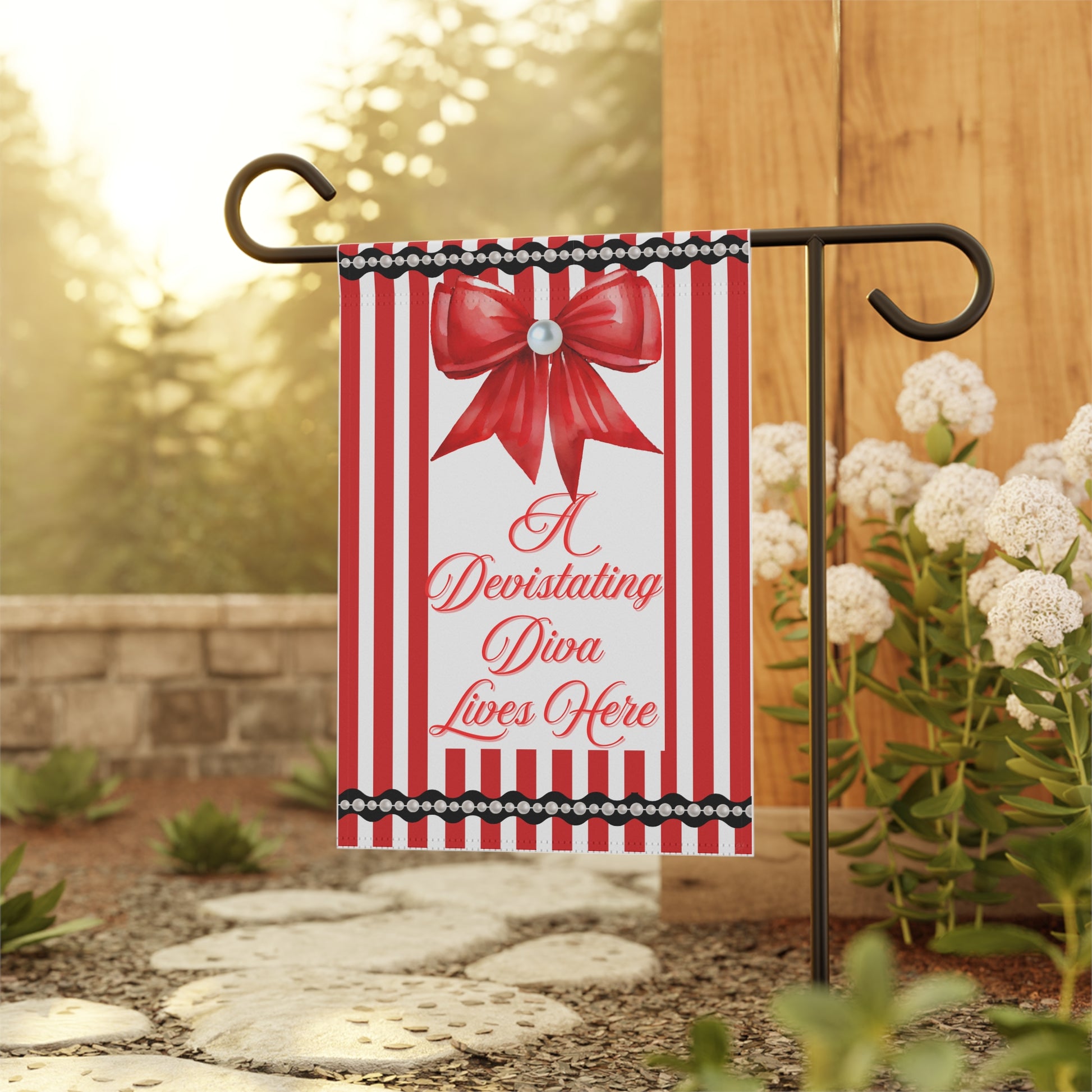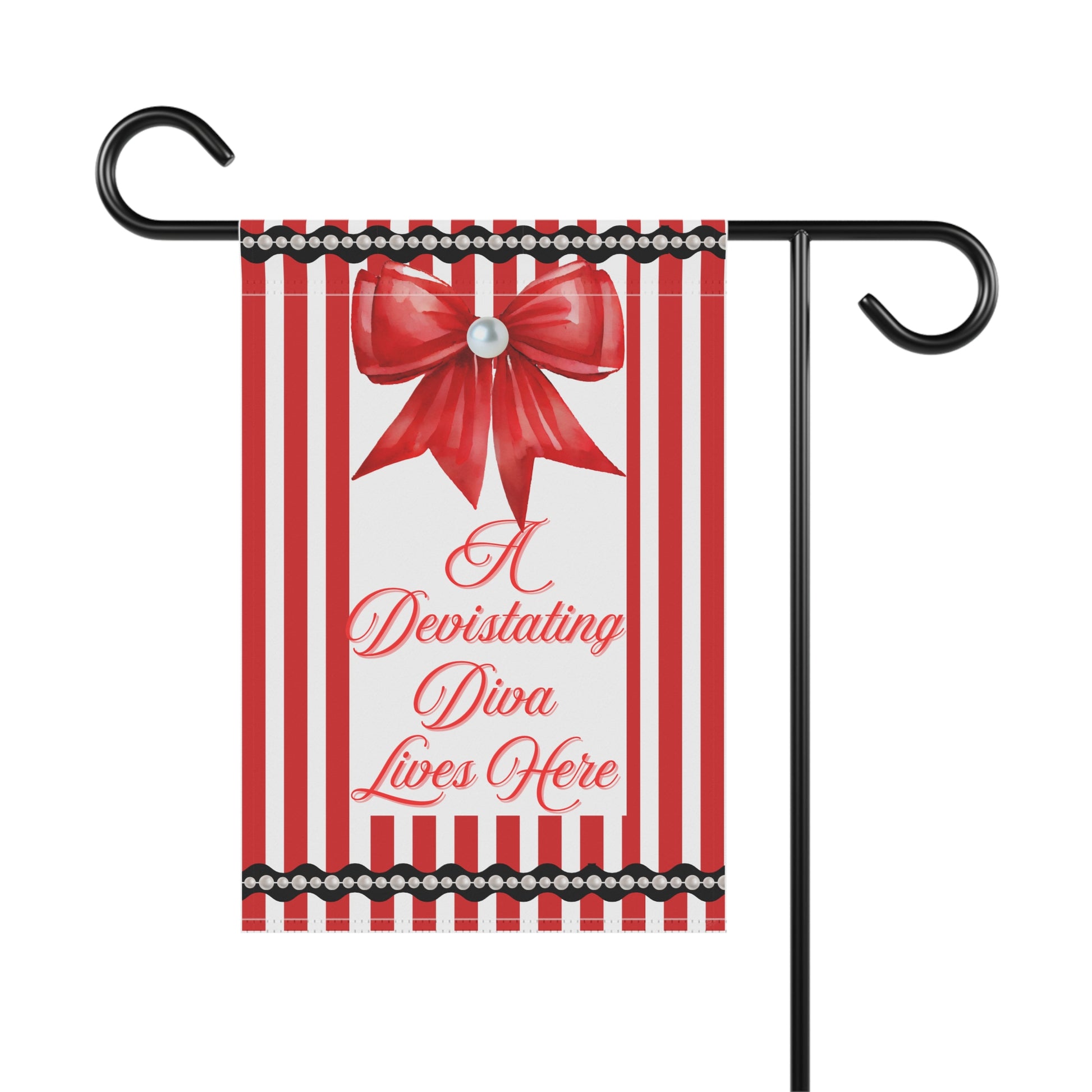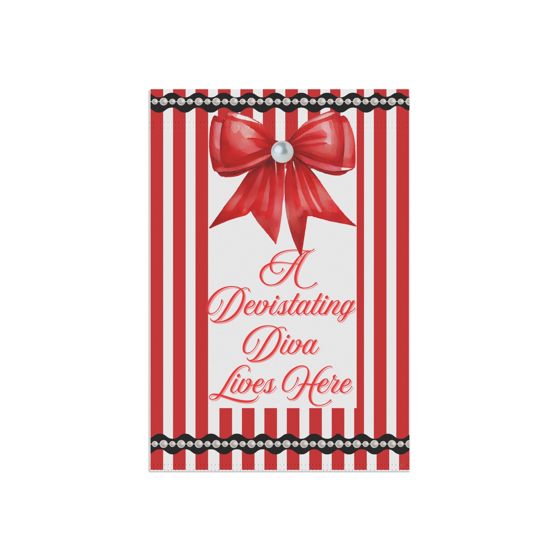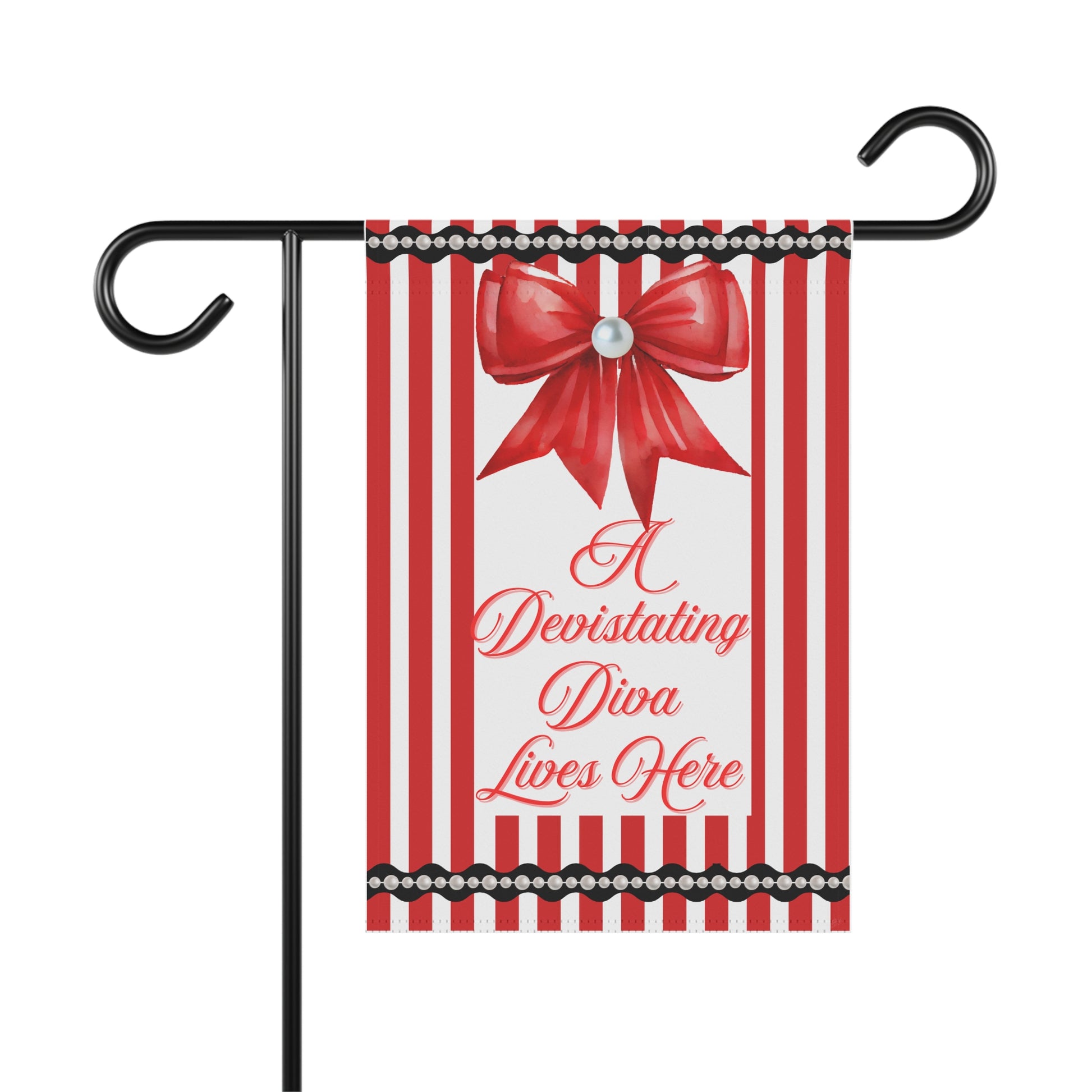 This Devastating Diva garden flag will make a great addition or gift. Made with lightweight yet highly durable poly poplin-canvas fabric, and features a top sleeve for easy placement on poles. Your design goes in crisp detail and color on both sides of the flag.